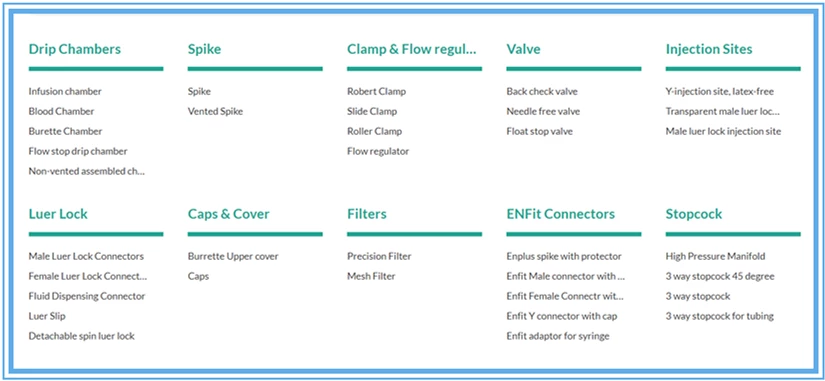 2. 組件產品 : 滴注腔,過濾器,尖峰,夾鉗和流量調節器,閥門,注射部位,魯爾鎖,蓋和蓋,ENFit連接器,旋塞閥